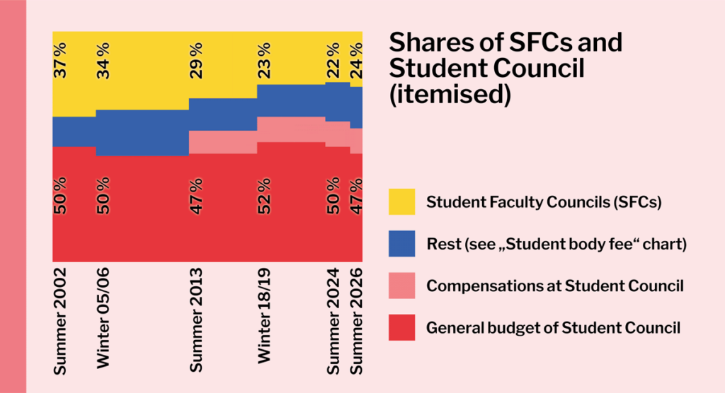 In 2002, the membership fee was just under €6. This changed in 2005, when it increased by €0.50 to fund the hastuzeit. In 2013, the fee was increased for the first time, with the SFCs now getting €2.20 per student instead of €2.05, while the Student Council started paying compensations. Five years later came the next increase. Compensation increased proportionately from €0.75 to €1.30, while simultaneously the Student Council’s general budget almost doubled, going from €3.50 to €6.20. The last change in membership fees took place in 2024, as for the full membership in the fzs (“Free Alliance of Student Bodies”) every student now had to pay an additional €0.40.