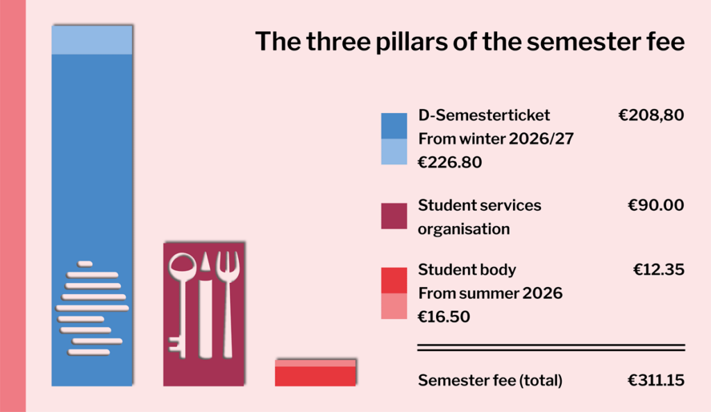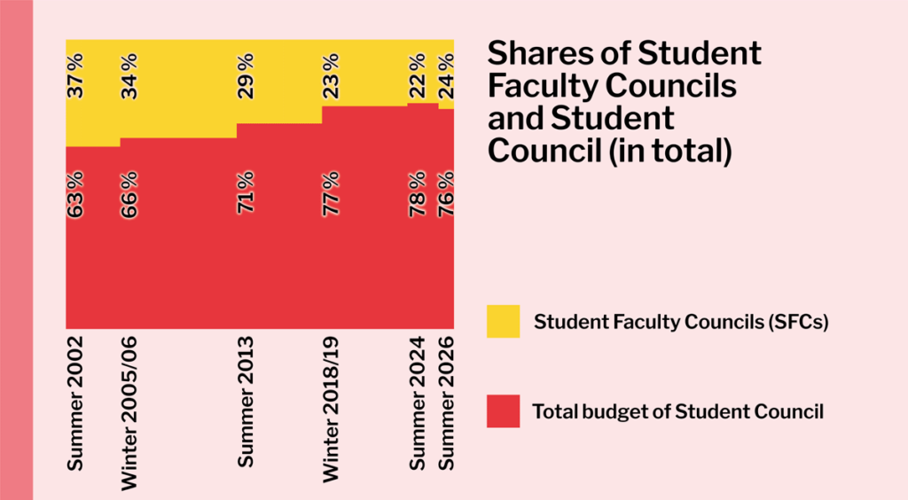 Most of the Student Faculty Councils who replied to our inquiry support a fee increase of the share that benefits them. A specifically demanded amount was brought forward by the representatives of the law students. In order to compensate for the inflation of the past seven years (which was circa 20%), they demand a SFC budget increase to a share of 25% of the student body’s membership fee. The SFC Medicine also demands inflationary adjustment, but additionally wants to revert back to the proportion of budgetary percentage shares of pre-2018 (circa 30%). If the student membership fee were to stay the same at €12.35, this would mean €3.70. At the end of June 2025, the Student Council decided to raise the fees to €16.50, thus increasing the SFC share to €3.90. They now receive a percentage share of 24% instead of the current 22%. The increased membership fee will take effect in the 2026 summer semester.