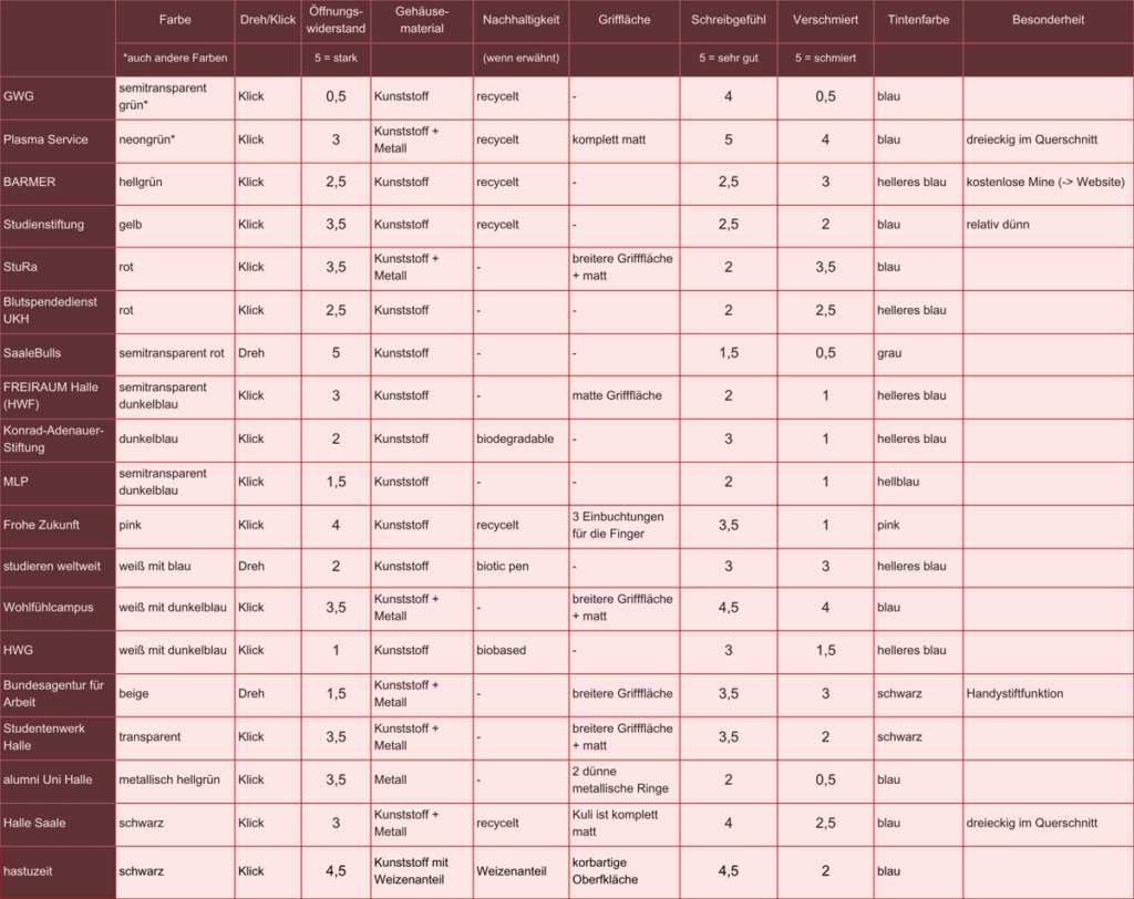 Das wichtigste Thema bei öffentlichen Veranstaltungen – nach den Verpflegungsständen natürlich – sind die Werbegeschenke. Im Rahmen des Hochschulinformationstages haben wir für Euch den wohl wichtigsten Werbeartikel getestet, den Infostände zu bieten haben: Kugelschreiber.