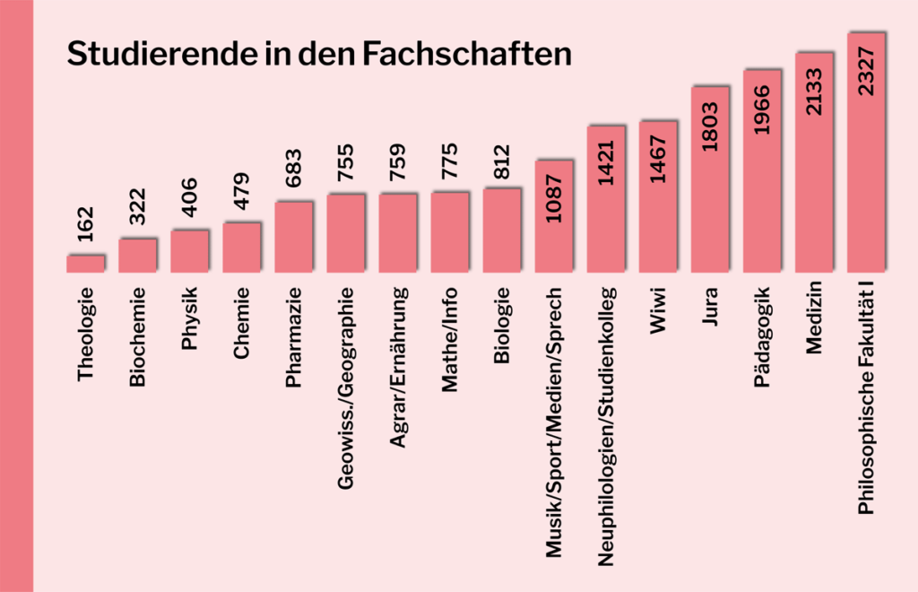 Unsere Universität mit ihren neun Fakultäten teilt sich in 16 Fachschaften auf, welche durch ebenso viele Fachschaftsräte repräsentiert werden. Neben den im Semesterbeitrag enthaltenen Kosten für Studentenwerk und D‑Semesterticket – die den Löwenanteil bilden – erhalten auch die FSRs ihr Geld über den Mitgliedsbeitrag der Studierendenschaft, den wir jedes Semester mitbezahlen. Seit der letzten Erhöhung zum Wintersemester 2018/19 bekommen die Fachschaftsräte 2,75 Euro pro studierender Person. Die kleinste Fachschaft ist darunter die der Theologie mit circa 160 Studierenden und die größte mit rund 2300 die zusammengefassten Fachschaften der Philosophischen Fakultät I. Damit einher geht ein deutlich unterschiedlich großes Budget für verschiedenste Projekte – wie Feiern, Spieleabende, Vortragsreihen und so weiter.
