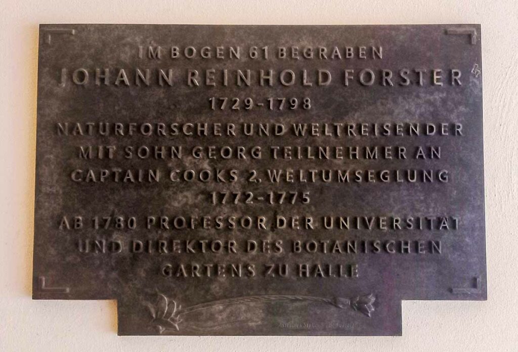 Unscheinbar ist sein Grab auf dem Stadtgottesacker in Halle an der Saale: Bogen 61 in der südöstlichen Ecke des Friedhofs. Von jahrhundertealten Bäumen umgeben ruht hier ein eher unbekannter, jedoch bedeutender Gelehrter aus der Zeit der Aufklärung. Johann Reinhold Forster, ein Name, der in wissenschaftlichen Kreisen noch immer als führender europäischer Naturforscher des südlichen Pazifikraums im 18. Jahrhundert gilt, ist im Gedächtnis der Menschen in Halle nur selten präsent, was durchaus verwundert!