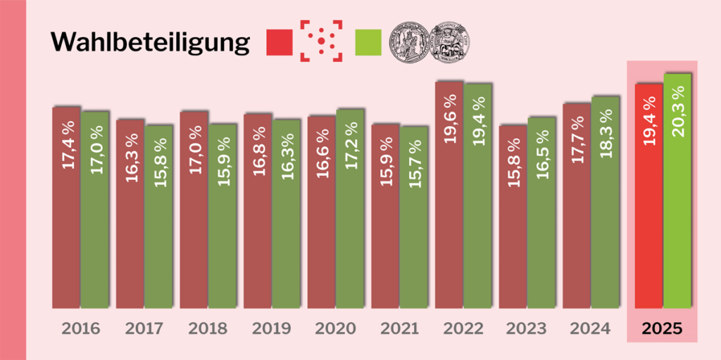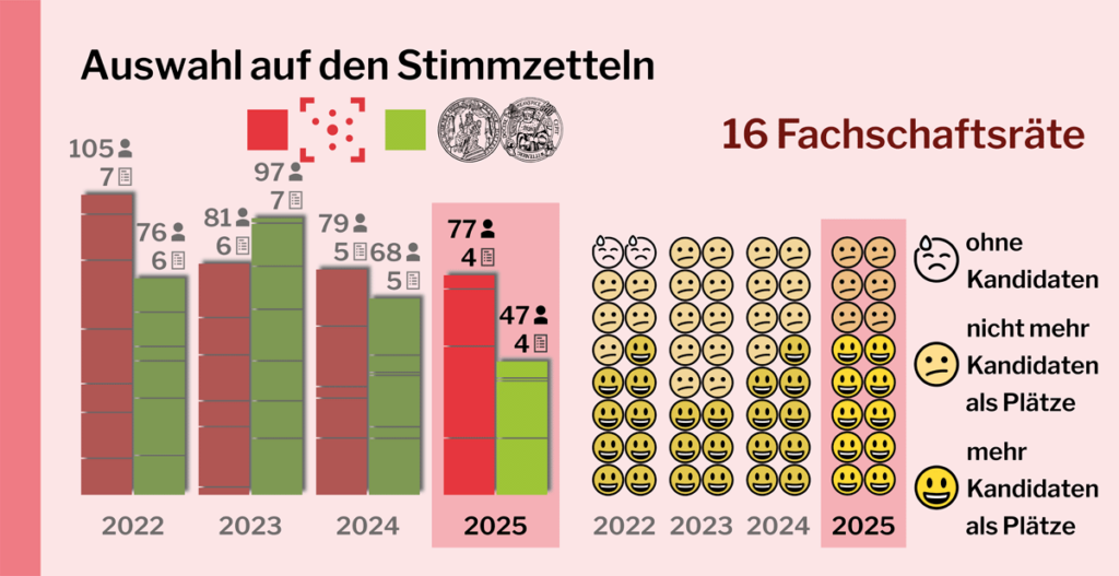In den Wochen vor der Wahl hatte es vielversprechend ausgesehen. Auf einigen Listen standen mehr Bewerber als im Vorjahr, und abgesehen vom Studienkolleg hatten sich für alle Wahlkreise Kandidaten gefunden. Andererseits traten erneut weniger verschiedene Hochschulgruppen und Listen an; die programmatische Vielfalt nahm damit ab. Besonders das starke Ergebnis im Senat haben die Jusos womöglich der schwindenden Konkurrenz zu verdanken: Kämpften 2023 noch sieben Wahlvorschläge für den Senat um die Gunst der Studenten, waren 2024 sechs und dieses Jahr gerade noch vier verschiedene Hochschulgruppen übrig. Der CDU-nahe RCDS trat nicht mehr an, und auch die Gewerkschaftsliste TVSTUD, letztes Jahr noch aus dem Stand erfolgreich, verzichtete auf eine Senatsliste und kandidierte nur noch stark geschrumpft für den Studierendenrat. Beide Gruppen konnten offenbar keinen Nachwuchs für sich gewinnen.