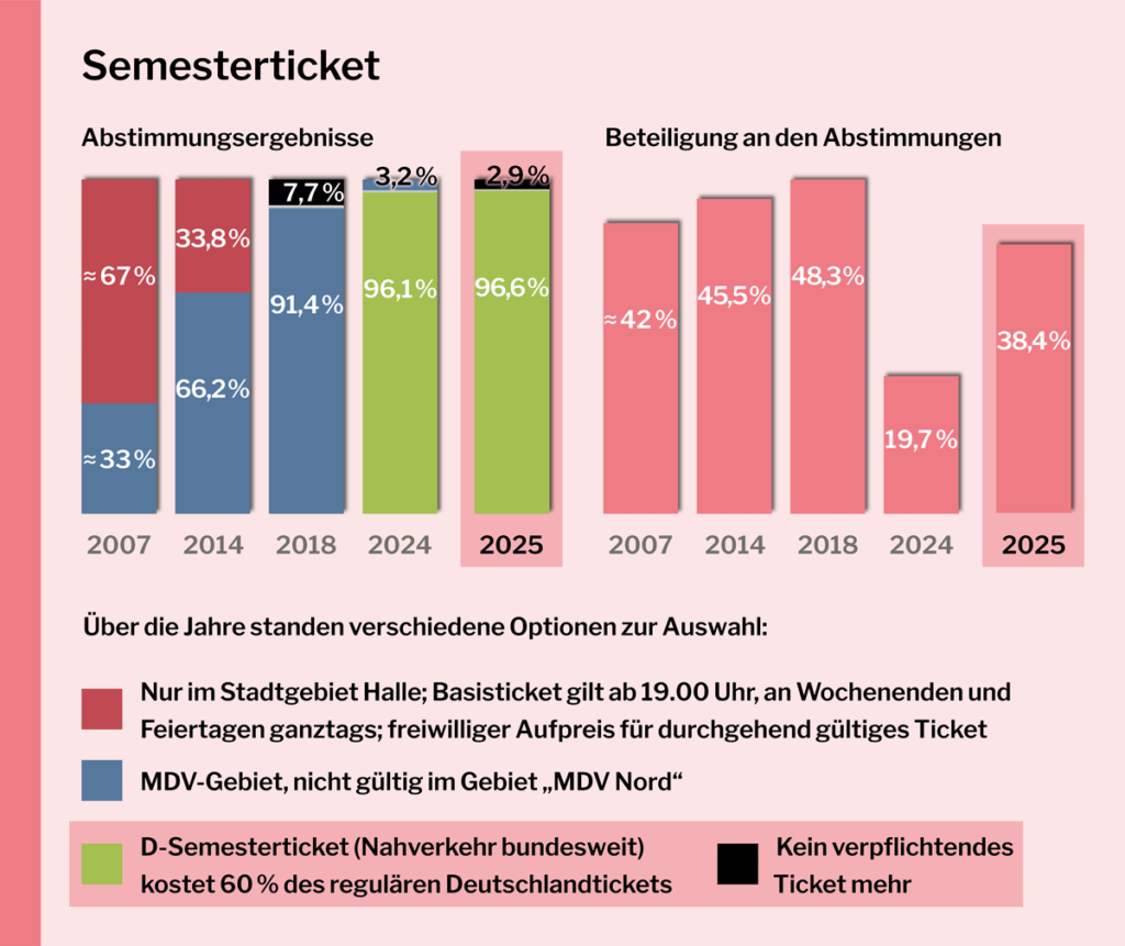 Bereits im letzten Jahr fand eine Urabstimmung zum D‑Semesterticket statt. Damals stand das MDV-Ticket als kaum günstigerer Vorläufer des deutschlandweiten Tickets noch zur Auswahl, denn der fünfjährige Vertrag zwischen dem Studentenwerk und dem Mitteldeutschen Verkehrsverbund lief noch. Dass dieses Jahr schon wieder abgestimmt werden sollte, lag an der Verteuerung des Deutschlandtickets um 9 Euro zum Jahresanfang. Daran gekoppelt wird das Deutschland-Semesterticket ab Oktober um 5,40 Euro teurer; insgesamt kostet es dann 208,80 Euro pro Semester. Vor der ersten Urabstimmung hatte der Studierendenrat versprochen, bei einer Preiserhöhung erneut alle Studenten zu befragen.