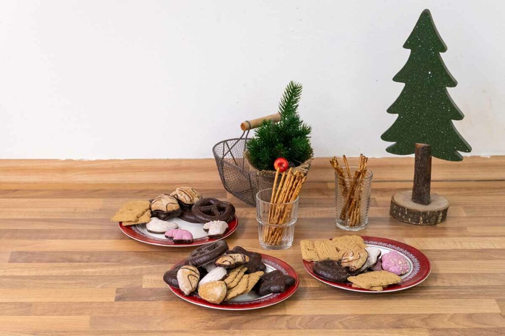 mit Schokoüberzug) und Spekulatius. Wenn Ihr experimentierfreudig seid, darf auch etwas Laugengebäck, zum Beispiel Salzstangen, in die Mischung.