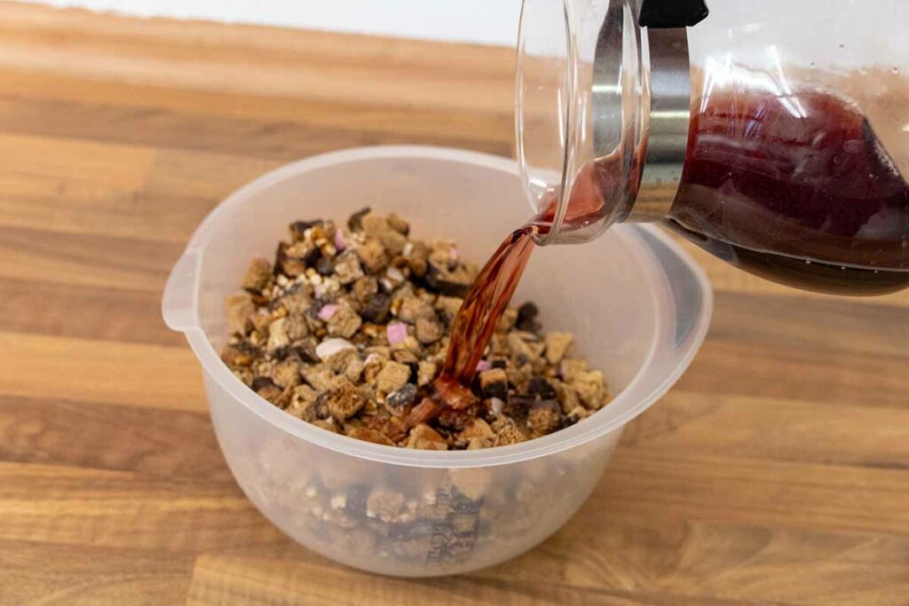 Die Gebäckmischung in kleine Stücke schneiden, in einem Rührgefäß mit dem Glühweinrest vermengen und eine Stunde lang einweichen lassen. Zwischendurch umrühren. Ofen auf 180 Grad (160 Grad Umluft) vorheizen. Die Backform einfetten.