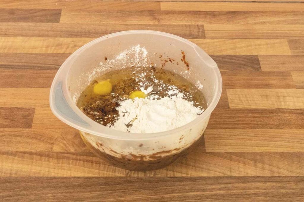 Eier oder Bananenmus und Öl zur eingeweichten Gebäckmischung geben und mit dem Handrührgerät und Schneebesen zu einer cremigen Masse verarbeiten. Mehl und Backpulver in eine Schüssel sieben und als letztes unterrühren.