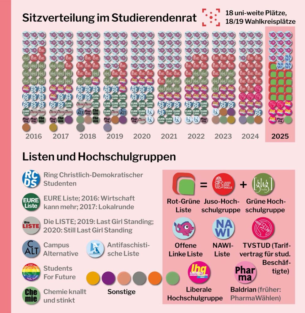 Der Studierendenrat der MLU, kurz Stura, ist die Interessenvertretung der Studis gegenüber Uni, Öffentlichkeit und Co. Die Mitglieder werden jedes Jahr im Sommersemester neu gewählt. Alle sind selbst Studis – so könnt auch Ihr Euch für einen Sitz im Stura aufstellen lassen! Kurz nach den Wahlen folgt die konstituierende Sitzung, auf der dann noch Positionen wie Vorsitz, Sitzungsleitung und Finanzen an Mitglieder vergeben werden, welche dann die jeweiligen Sprecher:innen sind. Neben gewählten Studierenden gehören auch insgesamt vier Angestellte zum Studierendenrat, die sich um Büroarbeit, Digitales und Öffentlichkeitsarbeit kümmern.