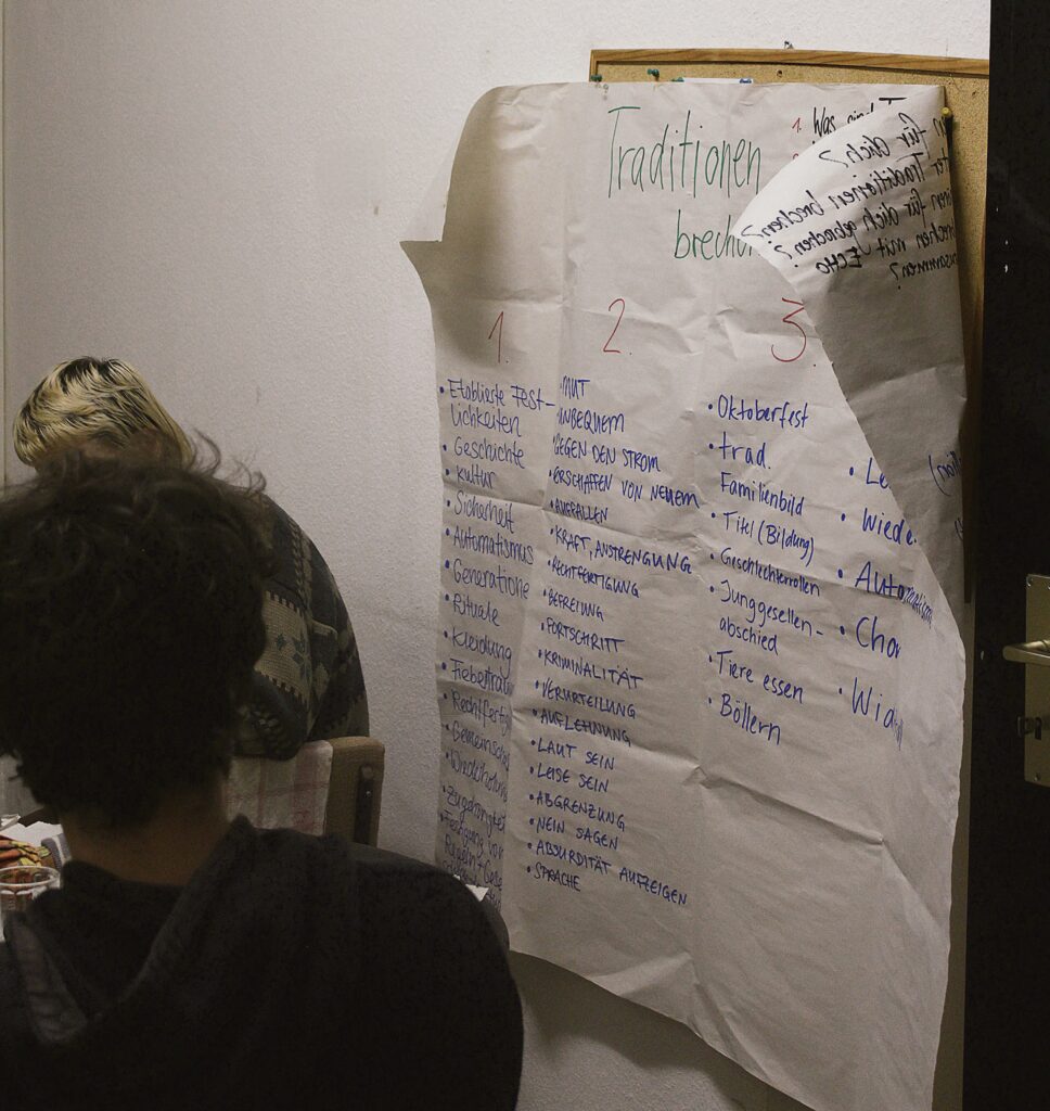 Nachdem die Gruppen in separaten Räumen ihre Szenen entworfen haben, treffen wir uns wieder im Probensaal. Während sich die Gruppe Stimmen mit dem Untergehen von leisen Worten in lautem Tumult und Unachtsamkeit beschäftigt, zeigt die Gruppe Echo eine humorvolle Darstellung von gesellschaftlichen Bubbles und die Resonanz zwischen ihnen am Beispiel von veganer und nicht-veganer Ente zu Weihnachten. Die letzte Gruppe, Traditionen brechen,beginnt mit einer Nachstellung des letzten Abendmahls, bevor Einzelne von ihnen über eine veraltete Tradition sprechen und die Aussagen „Das war schon immer so!“ und „Aber warum?“ einen lauten Schall im Raum hinterlassen, der unter allen Anwesenden nachwirkt.