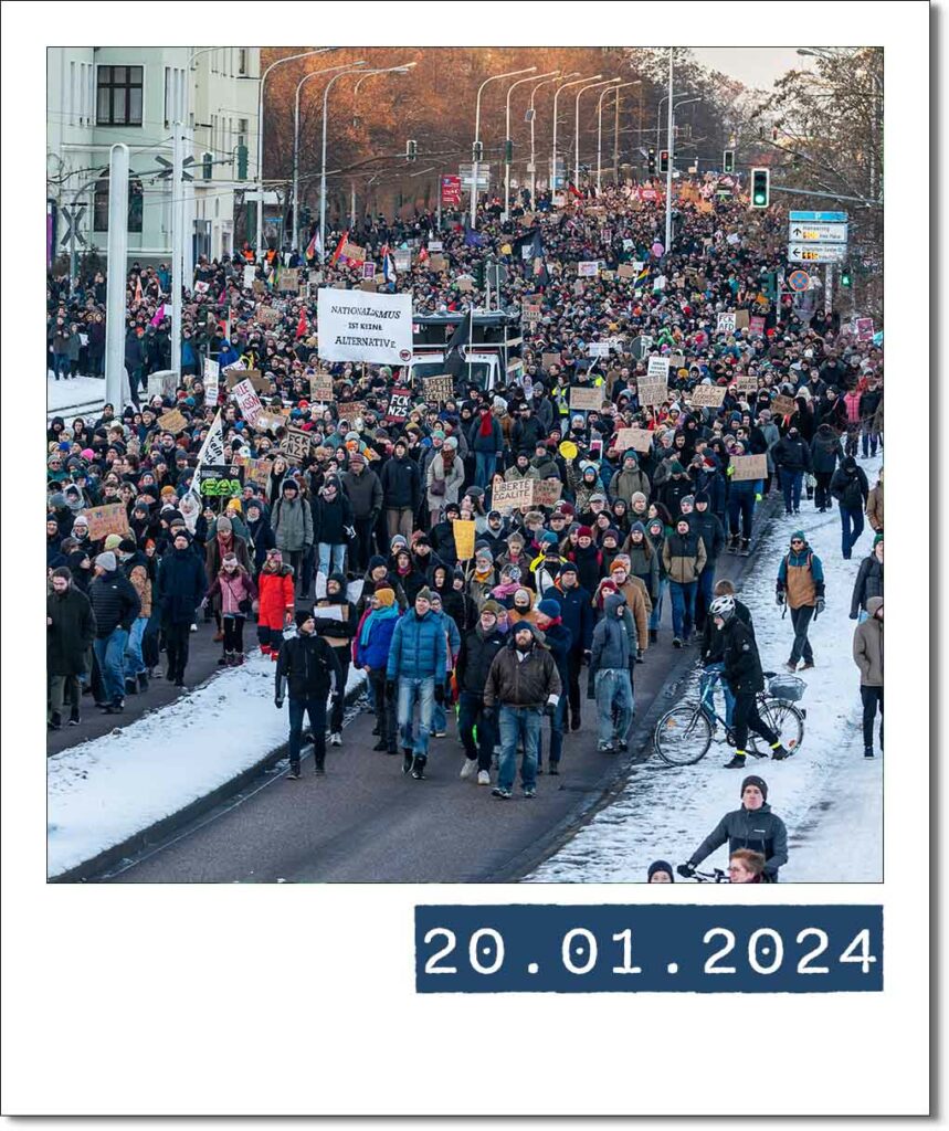 Rund 16 000 Menschen versammelten sich auf dem August-Bebel-Platz unter dem Motto „Dem Rechtsruck widersetzen – solidarisch. vielfältig. demokratisch.“ Es war die größte Demonstration in Halle seit der Wende. Anlass waren Enthüllungen über ein Treffen von AfD-Politikern und Rechtsextremen in Potsdam.