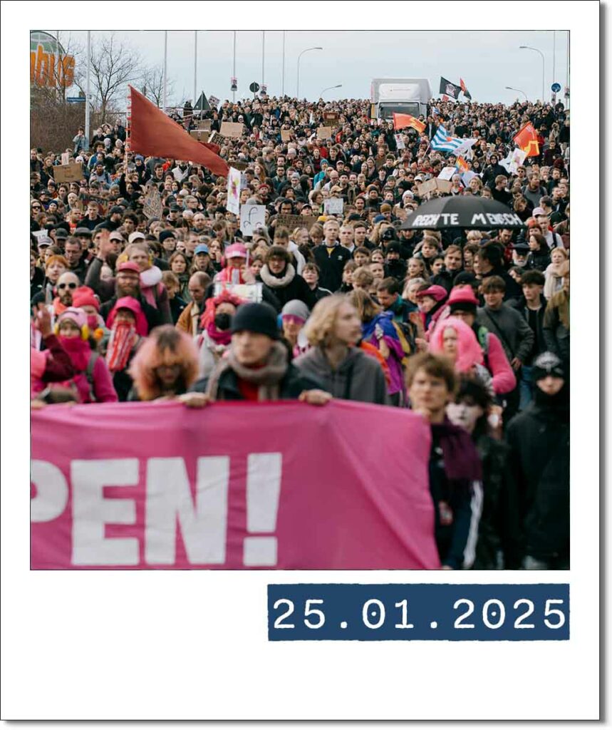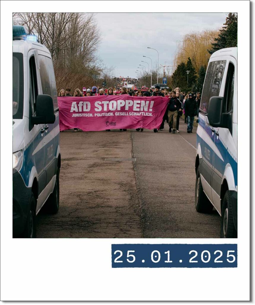 Von Massendemonstrationen gegen rechts und Forderungen nach einem AfD-Verbot bis hin zu Klimastreiks: Während sich über 80 Jahre altes Gedankengut wieder ausbreitet, formiert sich in Halle eine wachsende zivilgesellschaftliche Bewegung. Begleitet wird diese von tiefgreifenden politischen Umbrüchen auf Bundesebene. Ein visueller Rückblick auf über ein Jahr zwischen Protest und politischem Wendepunkt.